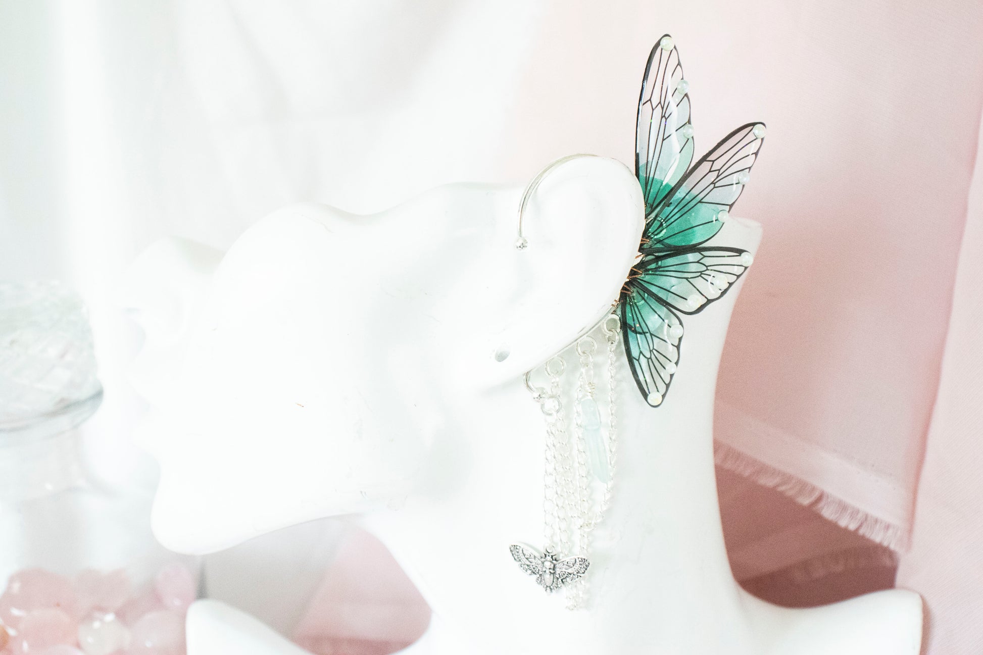 Ear cuffs feature teal fairy wings, silver chain, teal crystals, and moth charms.